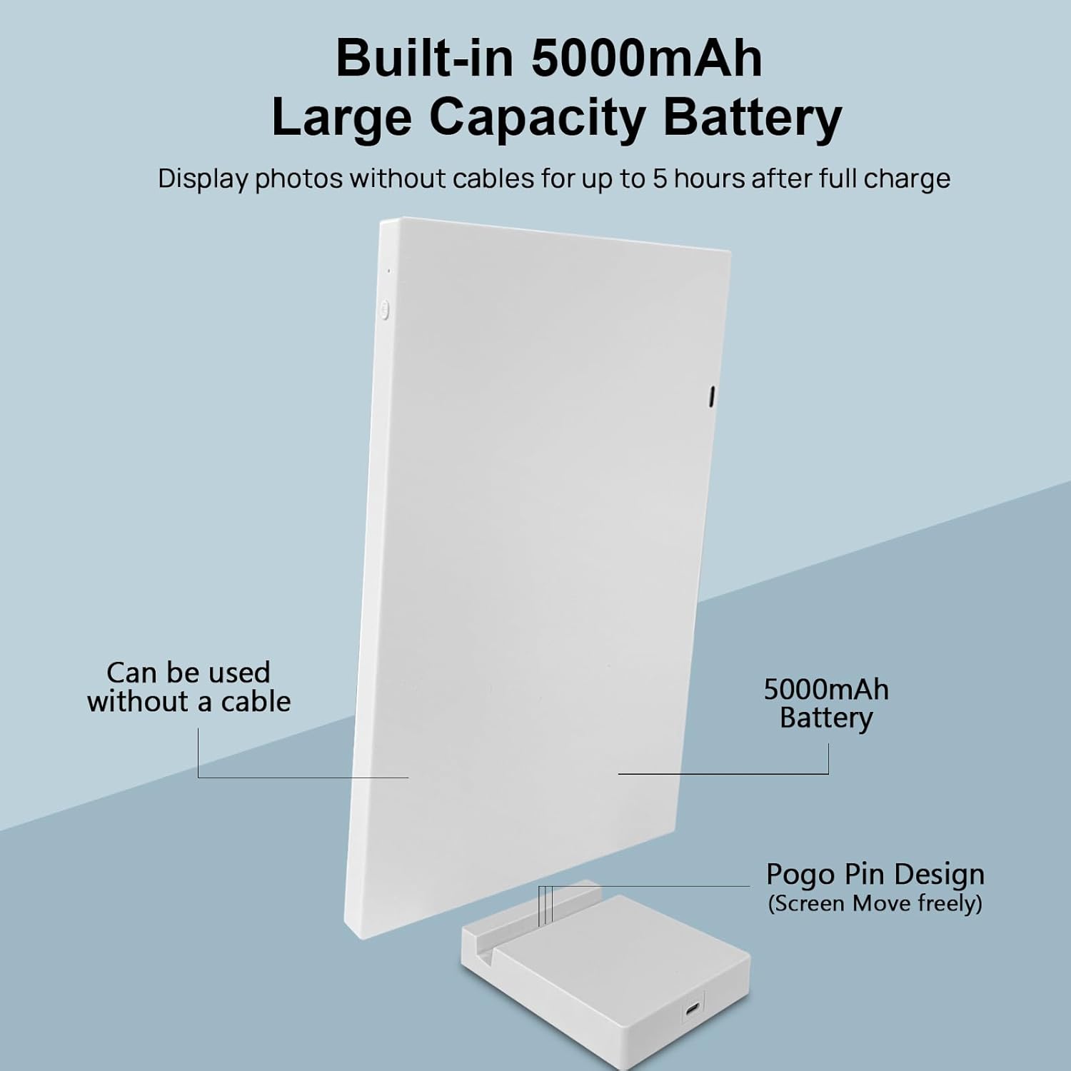 【Built-In 5000mAh Battery】Digital picture frame with a battery combines the functionality of a traditional photo frame with the convenience and flexibility of portability. Its built-in 5000mAh battery allows you to move it anywhere and share your precious memories with family and friends effortlessly.The absence of a power cord gives the digital picture frame a cleaner and more streamlined look.