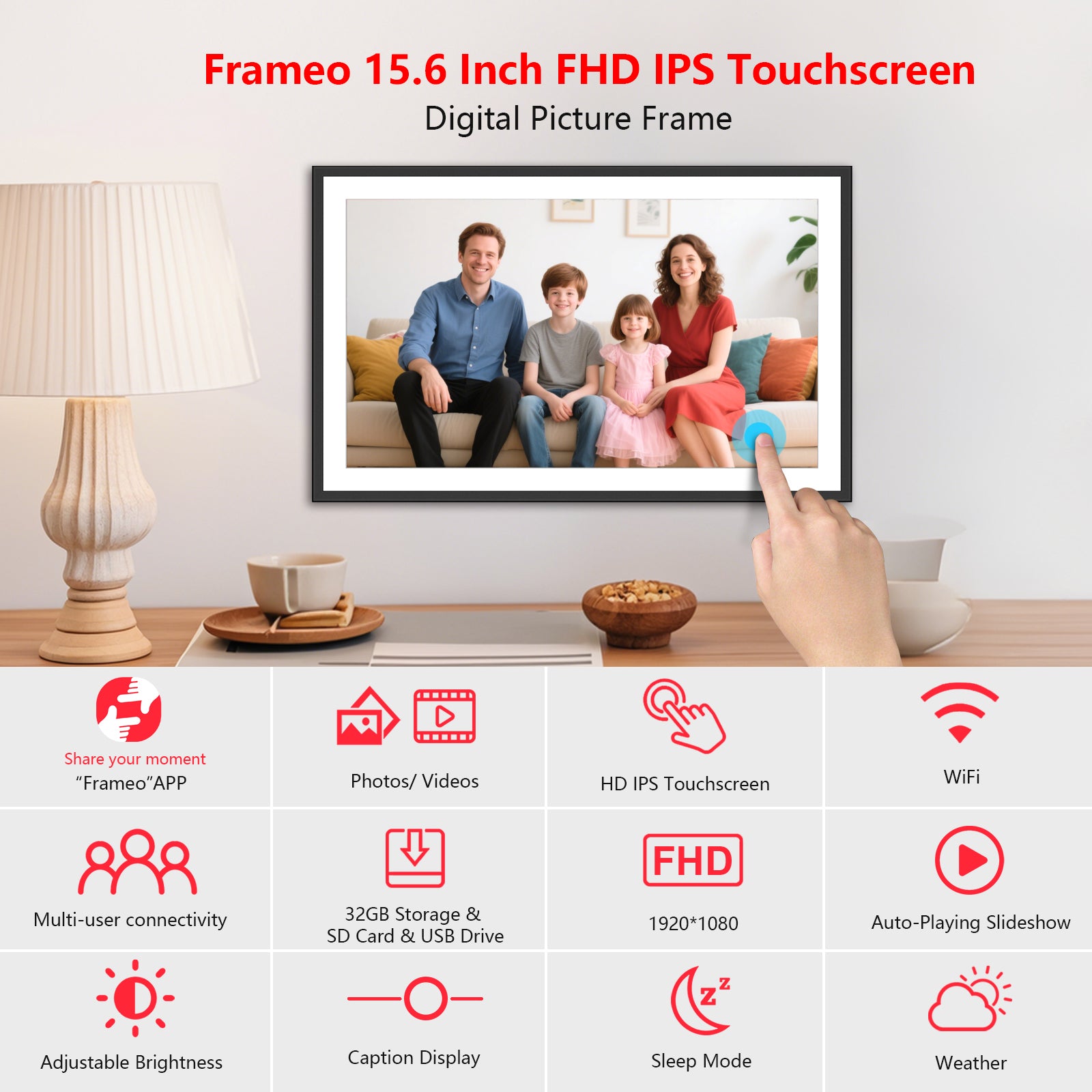 Frameo 15.6 Inch WiFi Digital Picture Frame, 1920x1080 HD IPS Touchscreen Digital Photo Frame Electronic, 32GB Storage, SD Card/USB Drive Auto-Rotate Wall Mountable, Share Photos/Videos via Frameo App